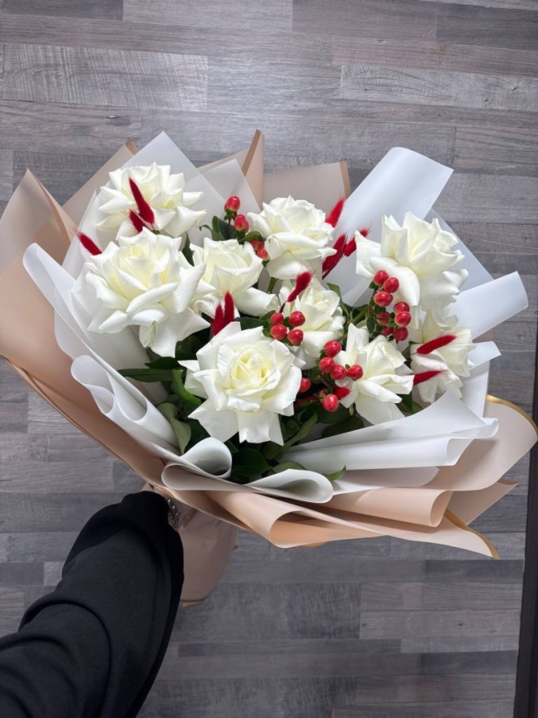 Состав: Одноголовая Роза, гиперикум, техническая зелень, сухоцвет лагурус, дизайнерская упаковка