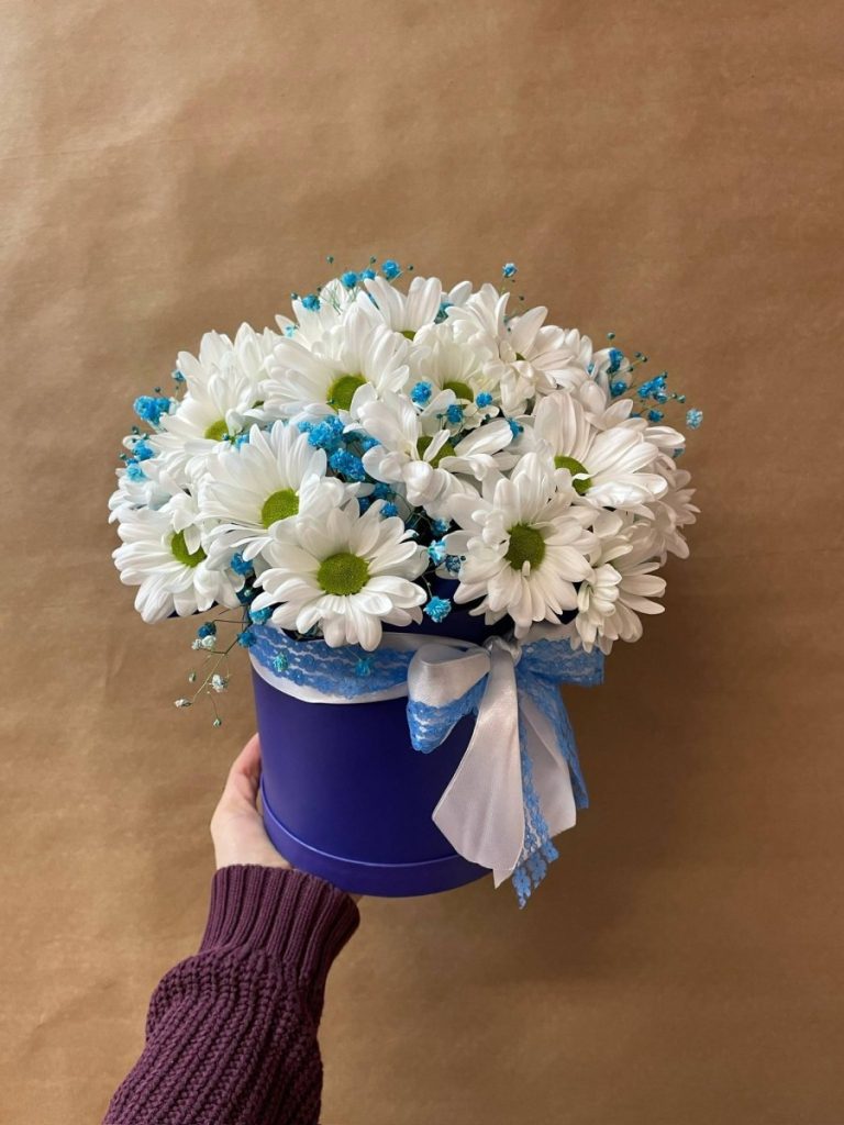 Состав: шляпная коробка, флористическая губка, атласная лента,кустовая хризантема, гипсофила