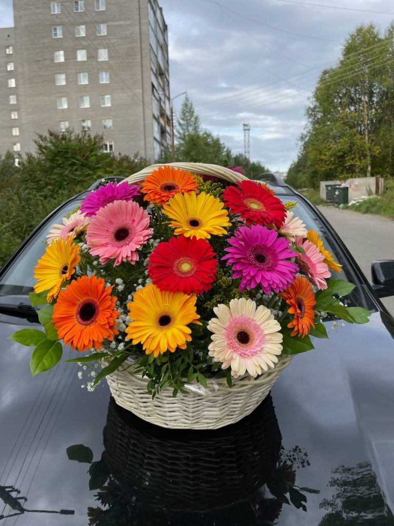 Состав: корзина плетенная, оазис флористический, фисташка, салал, солидага, гипсофила, гербера