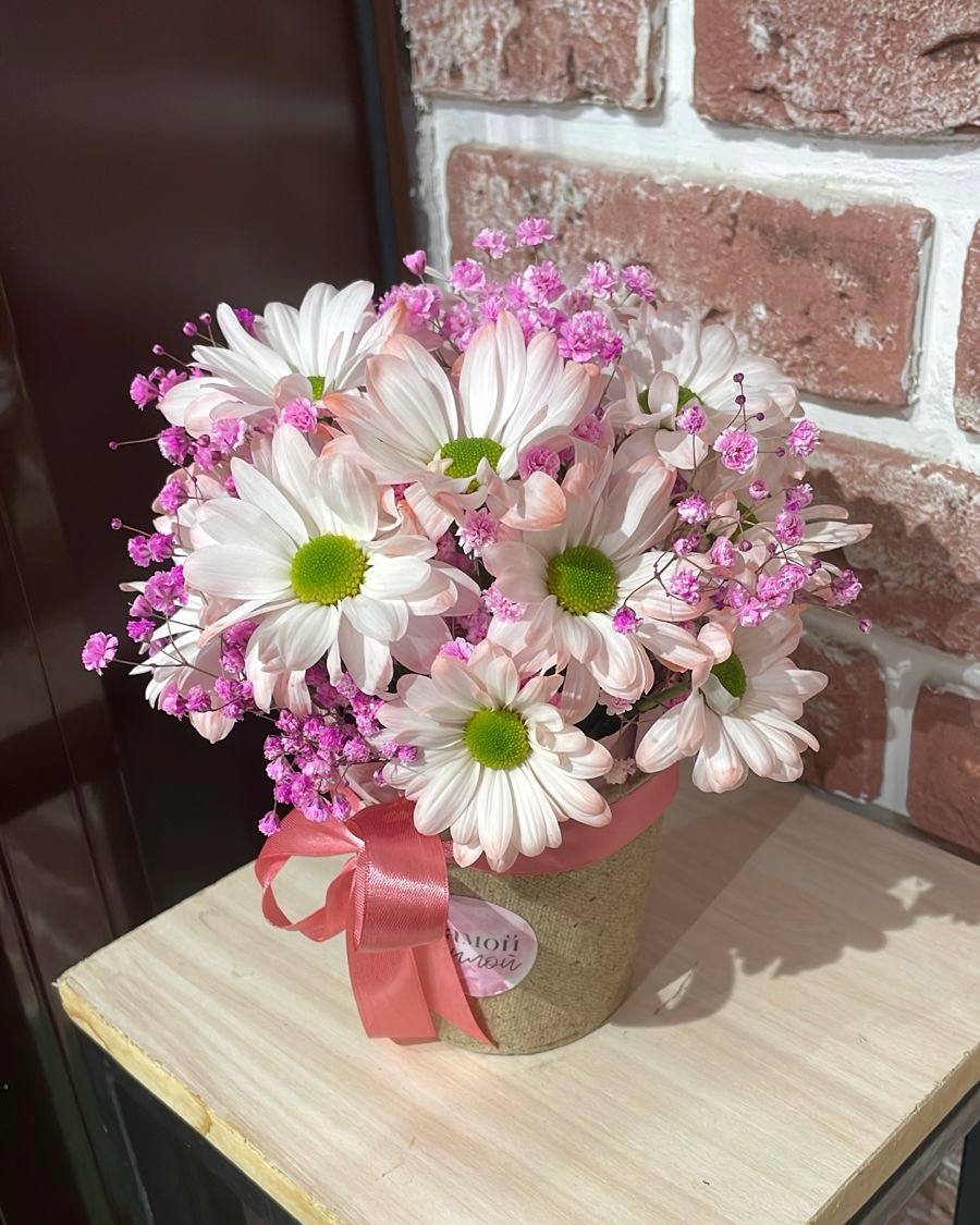 торфяной стаканчик, кустовая хризантема, гипсофила , лента атласная, флористическая губка