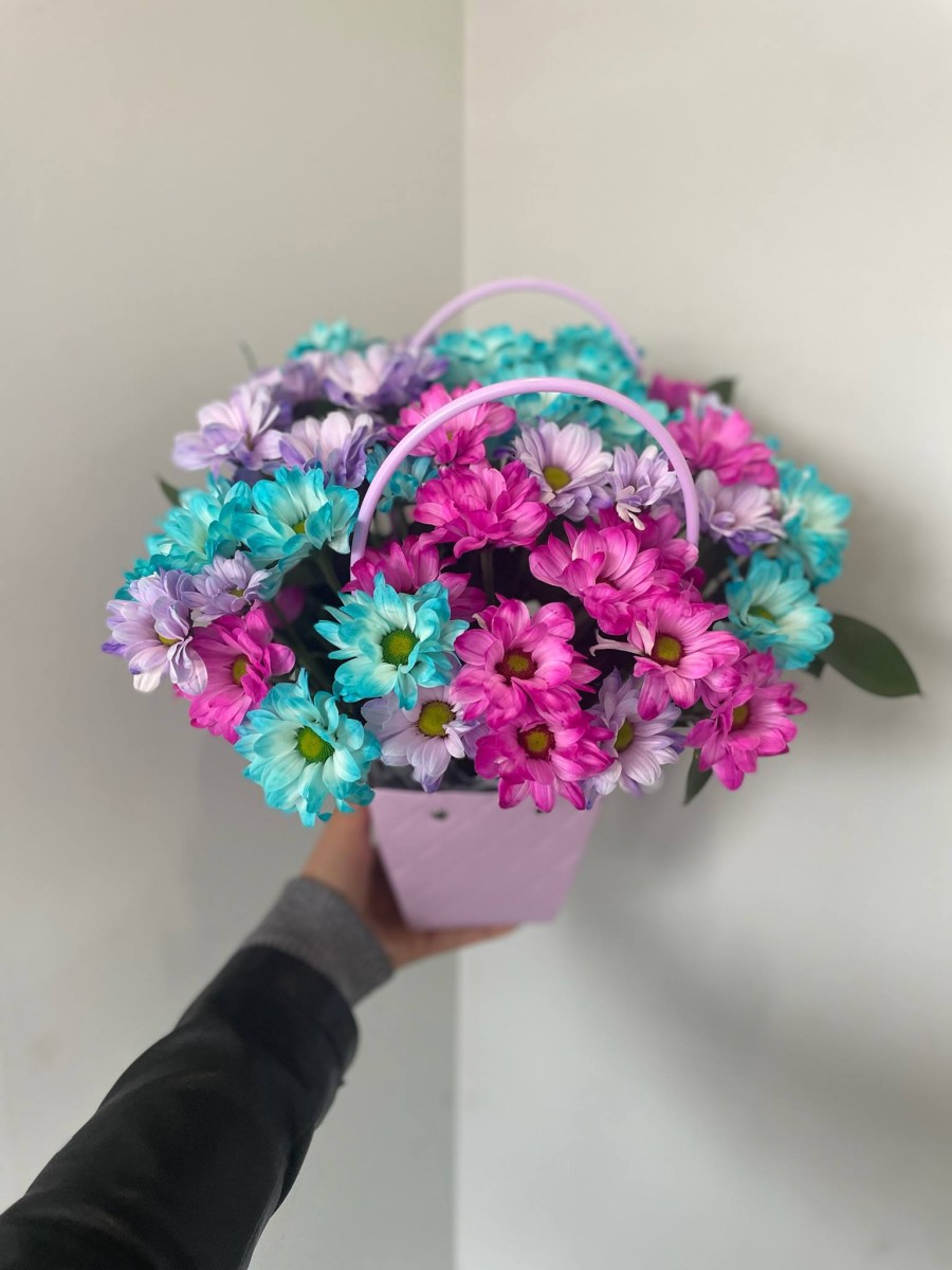 Состав: сумочка, флористическая губка, кустовая хризантема, Рускус