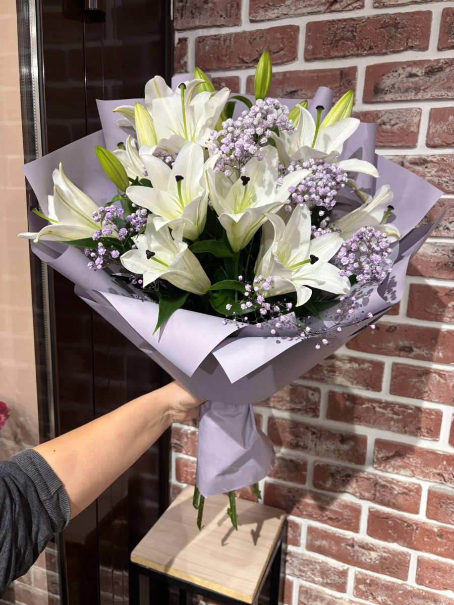 Состав: Лилия, гипсофила, дизайнерская упаковка
