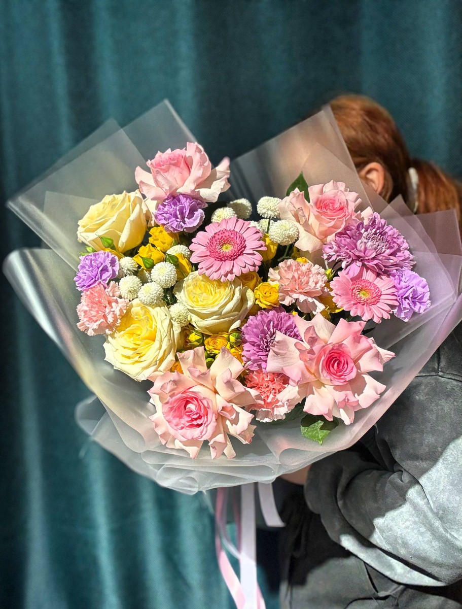 Состав: одноголовая хризантема, французская роза, кустовая роза, диантус, гербера, упаковка