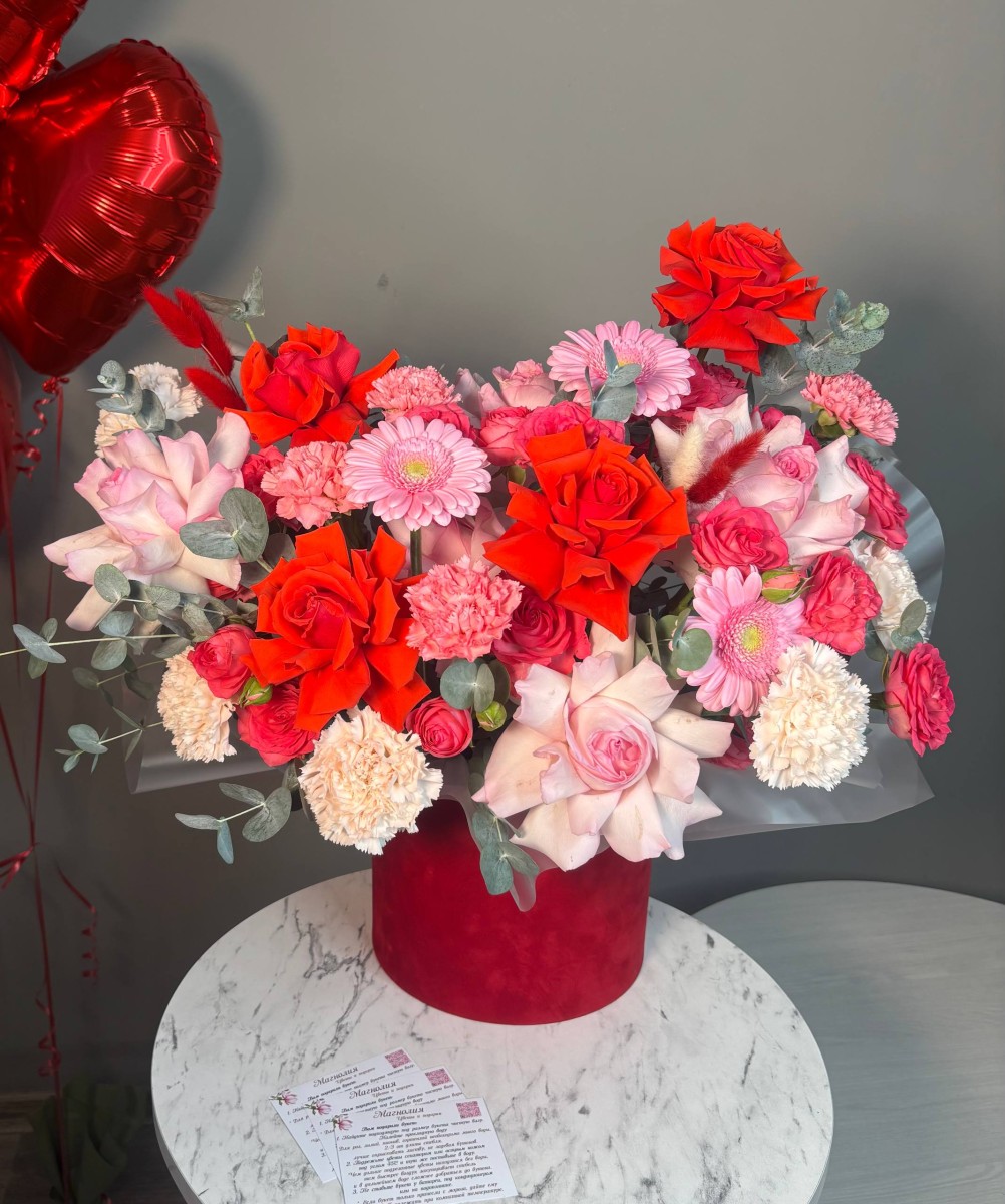 Состав: флористическая губка, шляпная коробка, французская роза, кустовая роза, диантусы, гербера, эвкалипт