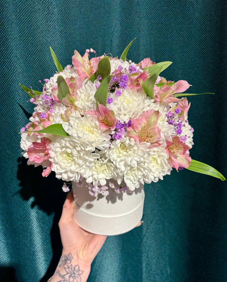 Состав: флористическая губка, шляпная коробка, кустовая хризантема, альстромерия, гипсофила