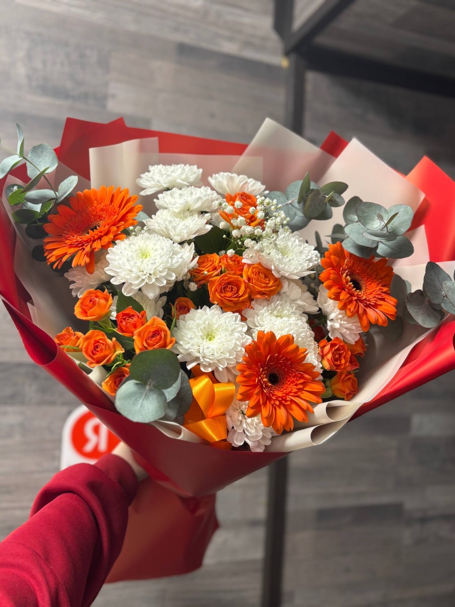 Гербера, кустовая роза, кустовая хризантема, гипсофила, эвкалипт, упаковка