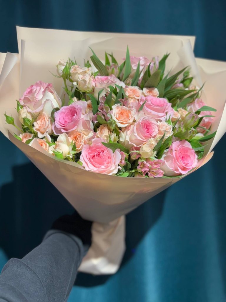 Состав: Роза, кустовая роза, альстромерия, упаковка