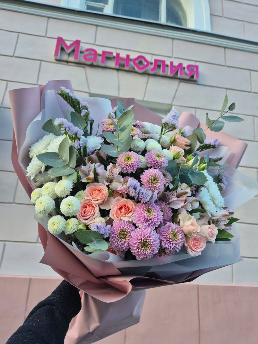 кустовая роза, кустовая хризантема, альстромерия, статица, эвкалипт
