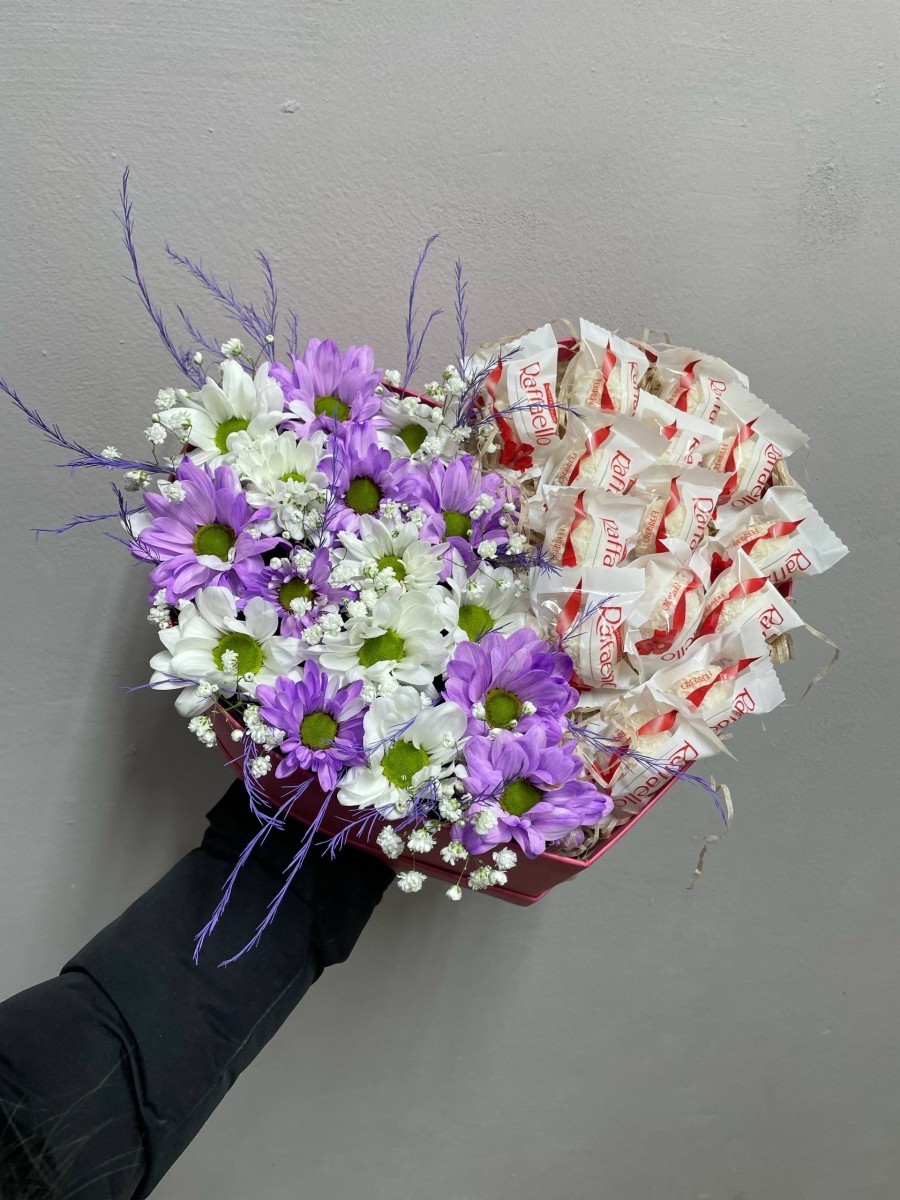 коробка в виде сердца, кустовая хризантема, сухоцветы, конфеты Raffaello, гипсофила