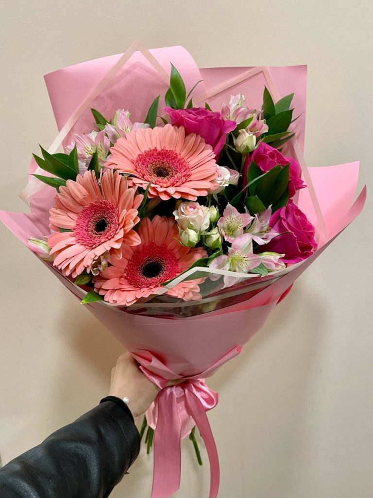 Состав: кустовая роза, гербера, роза, альстромерия, рускус, упаковка